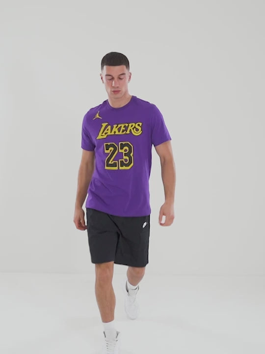 העלה את סגנון המגרש שלך ברמה עם חולצת ה-NBA LA Lakers Statement לגברים מבית ג'ורדן. בגוון סגול, החולצה הזו מגיעה בגזרה רגילה ועשויה מכותנה רכה וקלת משקל לנוחות מתמשכת. כוללת צווארון ריב עגול ושרוולים קצרים למראה קלאסי ובגימור עם השם של לברון ג'יימס ומספר 23 כדי להראות את גאוות הקבוצה שלכם. חתום עם סימן מילים של לייקרס והלוגו האגדי של ג'ורדן ג'אמפמן בחזית. ניתן לכביסה במכונה. | הדוגמן בגובה 183 ס"מ עם חזה 96.5 ס"מ ולובש מידה M.
